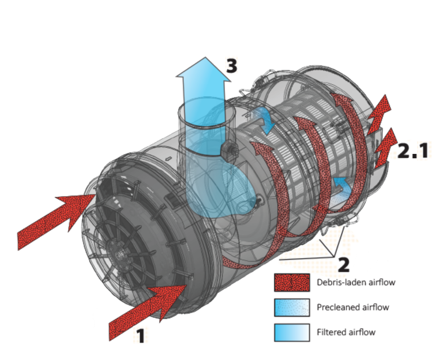 Las partículas son arrojadas a las paredes exteriores (2.1 Las más grandes salen por el puerto eyector en el caso de la unidad CF2) a medida que el aire más limpio es empujado a través del filtro.