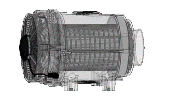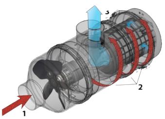 El aire cargado de escombros ingresa a la unidad donde las aspas del ventilador lo baten en un vórtice hacia la carcasa de la unidad.